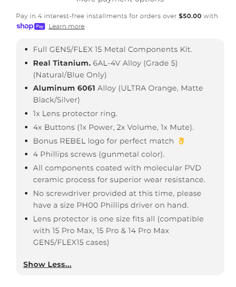 I bought the Phone Rebel Gen 5 back when it first dropped, put it on my phone, and hated the way those metal parts looked. Felt like the color clashed with my black titanium phone, or wasn’t my style at least. So it sat in my drawer, decaying ever since…. Now that I have the black components kit on it, might be my favorite case. Thing looks beautiful, grippy, buttons are click city… love the flush top bottom and sides for ease of use… took this case from a 2 to a 10 realllll quick! 🤣