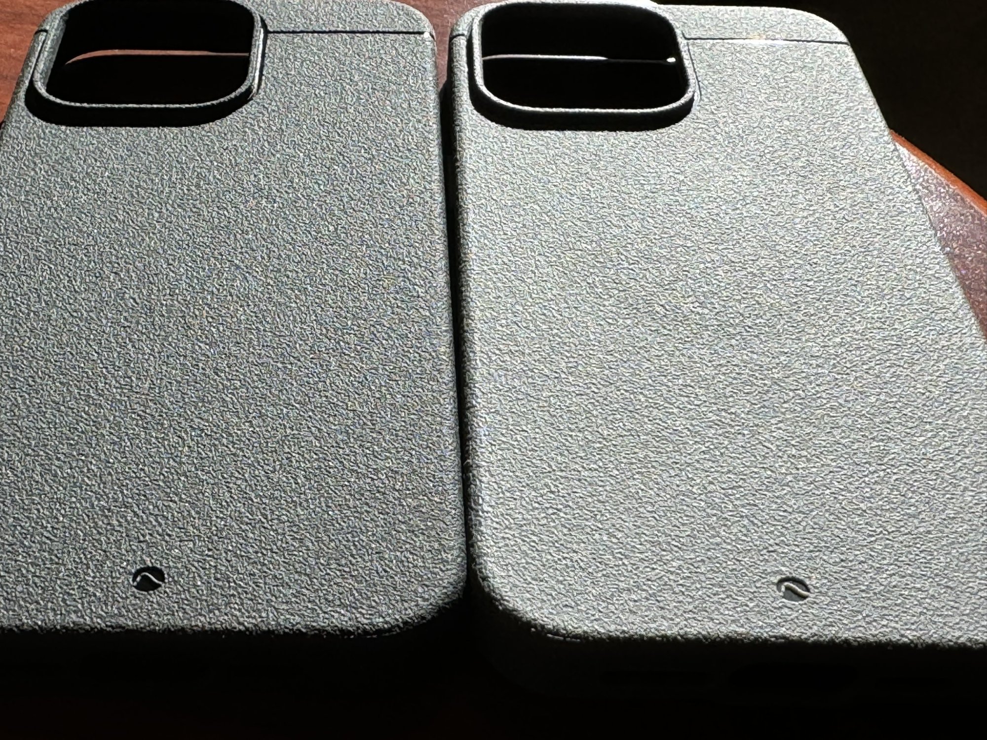 The light-colored one in the middle is an Elago Stone Silicone case purchased on Amazon for $16.50 shipped, weighing in @ 41.17g. it's actually much darker than it appears in the photos, more taupe than white. For the money it is extremely well made, with a strong magnet and stiff sides. There is a fine even mold-release line encircling the entire case mid-way between front and back, barely felt but visible, and its downsides are those endemic to all silicone cases being lint pickup and difficult pocket removal. I like the soft feel and it's a nice occasional change from the other two.