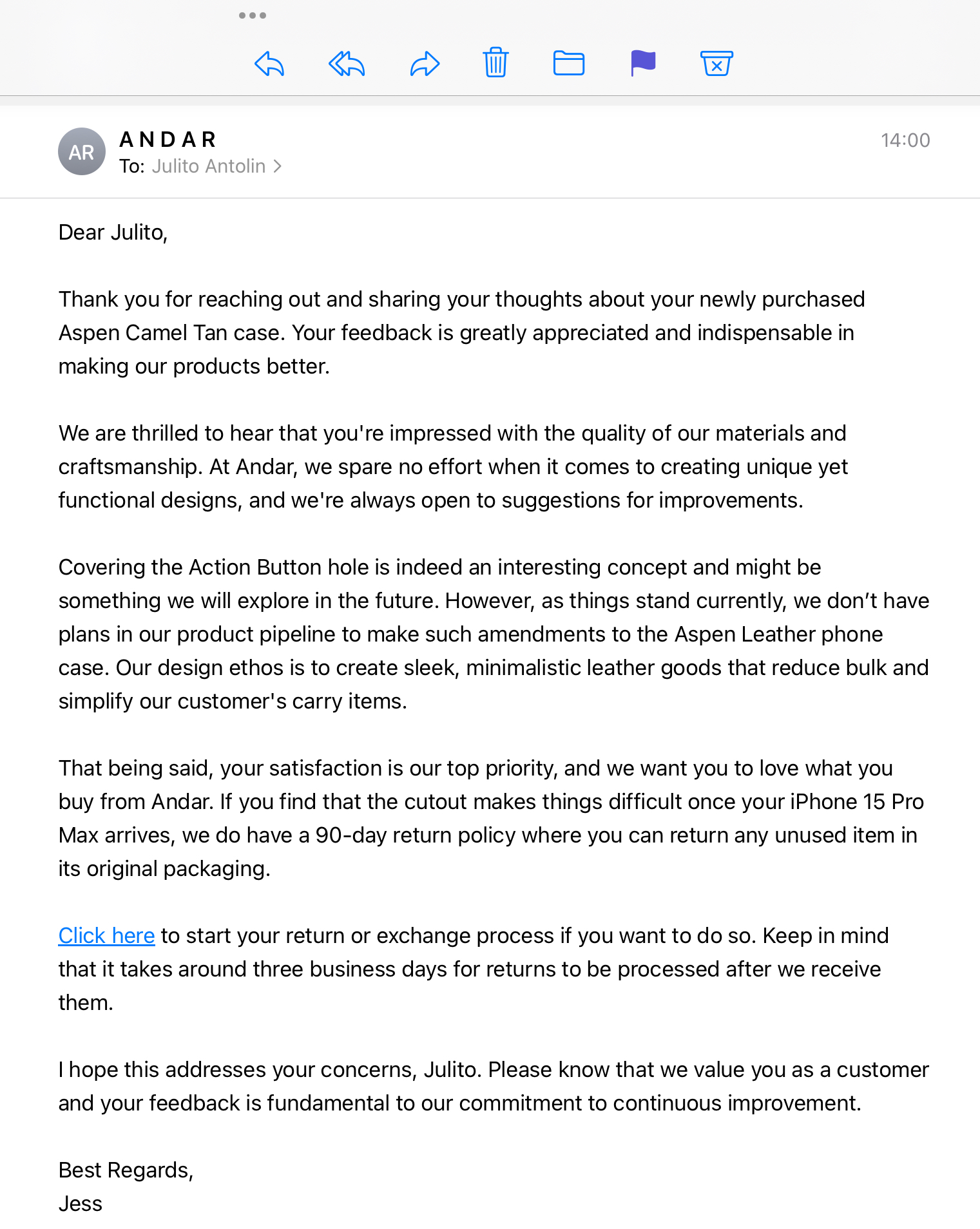 Well within 2 minutes of my e-mail sending - two separate folks at Andar wrote back. No plans for a button cover right now. Fair enough. They were cool about explaining the return policy. Professional customer service and it is a very well made case…just that damn action button cutout. 🥲Trust me I think they have heard a lot so far and the phone hasn't even released. But it wouldn't hurt to reach out and continue to bring it to their attention. Maybe its not a huge deal to some, but it’s a shame on them for taking a half @ss approach. This should have been the year all these leather case companies do all they can to win over all that lost business from Apple not offering leather anymore.