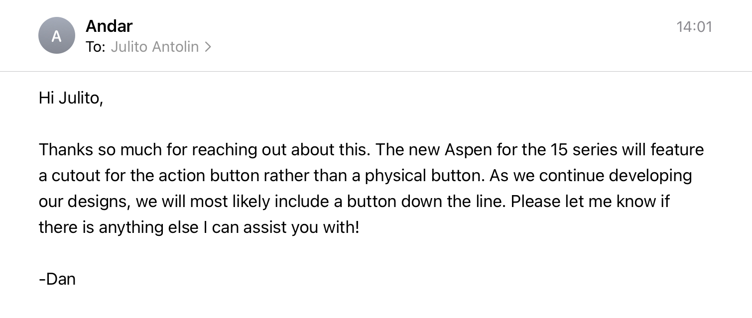 The second email there implies they actually will have a button next time, but just aren’t promising it for 15 series?Well within 2 minutes of my e-mail sending - two separate folks at Andar wrote back. No plans for a button cover right now. Fair enough. They were cool about explaining the return policy. Professional customer service and it is a very well made case…just that damn action button cutout. 🥲