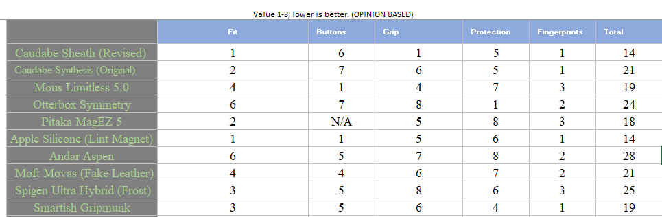 Which kind of aligns with my top case choices. I overhyped the Aspen, thought it'd be my #2, but it isn't. Not close, actually.So it looks like the top scores are tied at 14; Sheath, Mous Limitless and Apple silicone.