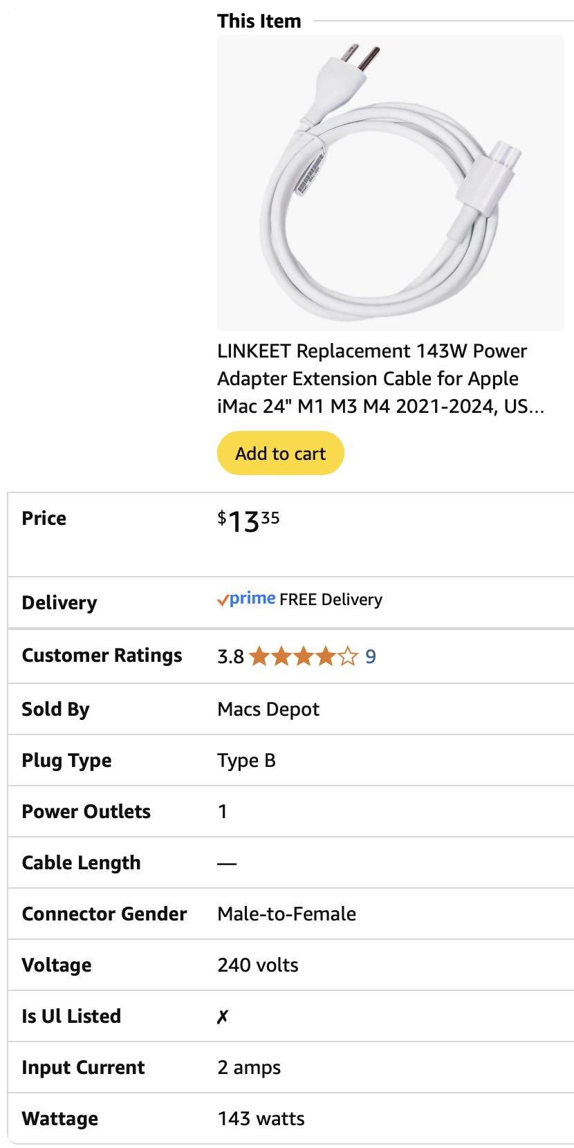 Please look at the two 6 foot cords I am contemplating. I'm not an electrician. Which would replace my M4 2024 10 core iMac (A3137) power cord. I think the cord must be a IEC320 C5 to NEMA 5-15P 3 prong, (143W Power Adapter Extension Cable), whatever it's called. One cord is rated 1250 watts. I just don't understand volts and watts to start a fire or burn the iMac up. The original power cord is 3 meters long, just too short.