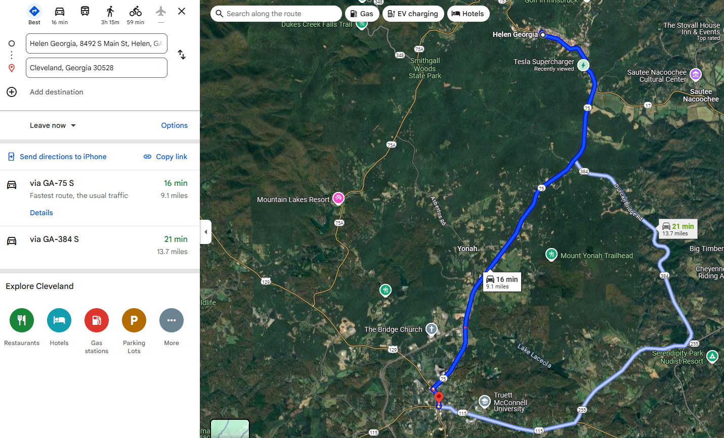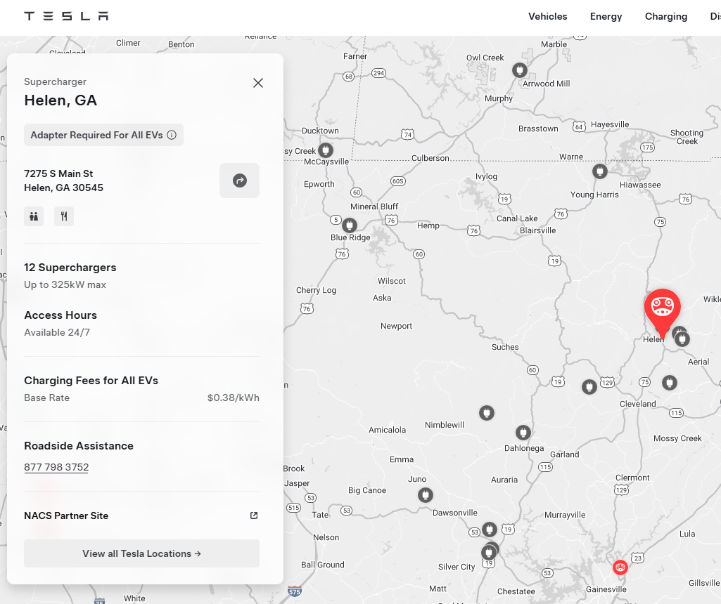 Wow Thanks! What a difference a few months makes. It looks like this is located near the Habersham Winery (or possibly in their parking lot). I'll be up there next month so I'll definitely check it out. This is actually closer to the house in Sautee Nacoochee. I mentioned Cleveland earlier because it's the county seat and the closest "city".FYI, it seems there is a Supercharger at Helen Georgia. <10 miles from Cleveland, GA