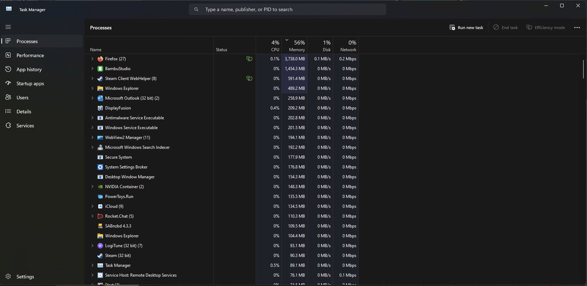 This is my Windows desktop with 64GB of RAM. If you looked only at the memory tab you'd see me using almost 60% of my RAM, but if you look at the things I'm running it is almost nothing. Firefox, Bambu Studio, Steam and some background processes. An in experienced user would incorrectly think I couldn't run this same load on a machine with 16GB or 32GB of RAM. They'd be very wrong.