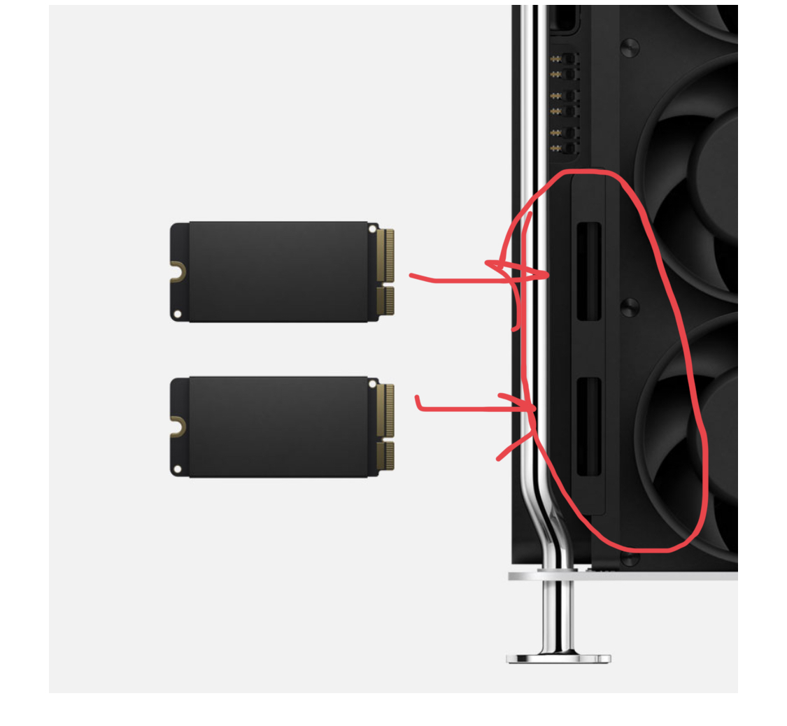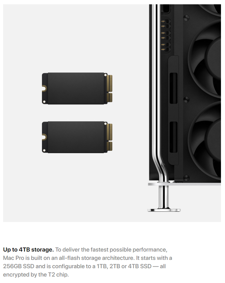 The T2 has a SSD controller logic inside of it. All it needs is NAND chips to 'talk' to complete the implementation of a full SSD. Apple probably has lifted the exact same design as the iMac Pro. Same upper cap of 4TB. The daughter cards don't have an SSD controller chip on them so they are not an SSD.
