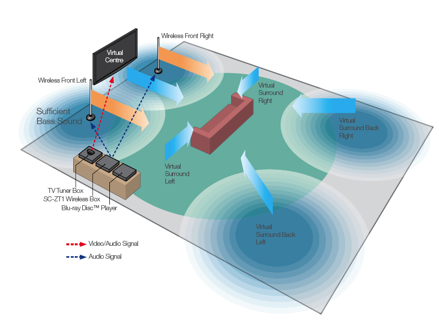 I would probably connect the sound from my MBP via the Head phone out port and connect directly into the Panasonic SC-ZT1 home theatre box which controls the wireless speakers. The SC-ZT1 has HMDI, Digital & Analogue inputs and outputs