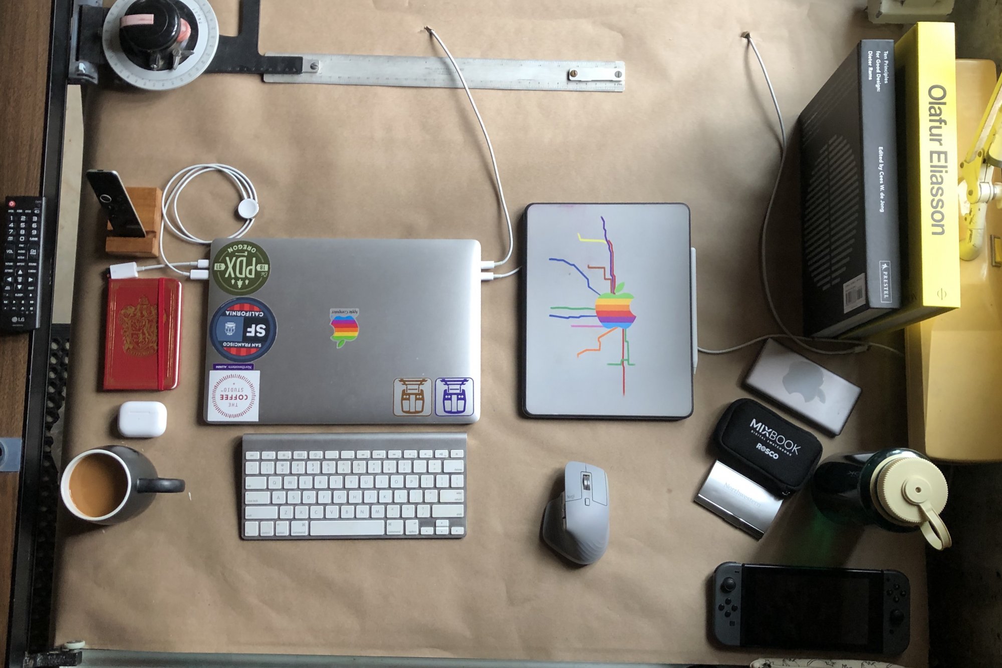 first Intel iMac. My make shift work from home setup (seen below), had me using my MacBook Pro and iPad Pro (with sidecar). As slick as I thought it was for the first month, my eyes rebelled against the small screen, and my graphics card rebelled against my increasingly 3D rendering intensive workflow (mostly drafting programs).