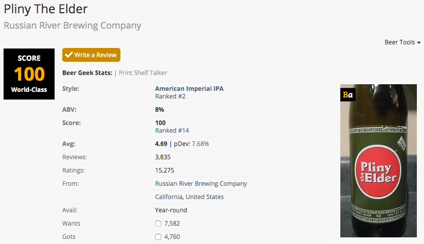 What is strange, is I like their "Blind Pig" better than both of the Pliny's... It is no sloucher as BA has it at 97!