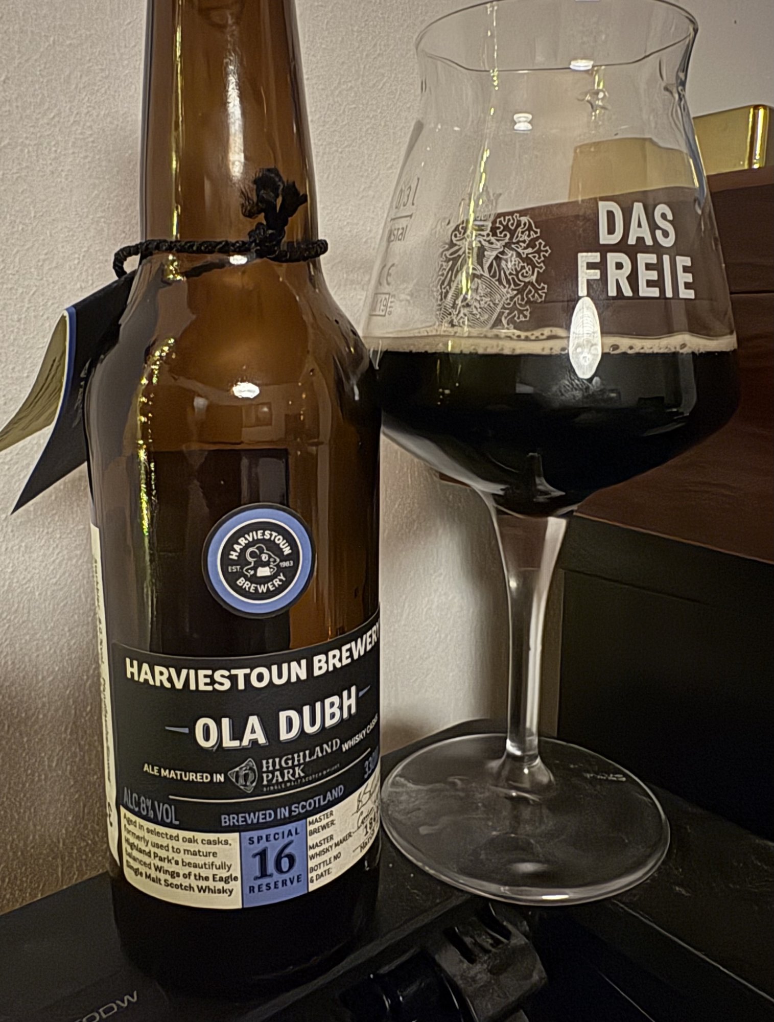Time for a stout from a 16-year old Highland Park cask. Very, very nice whisky beer nose. Flavour: Barrel matured in smoky whisky casks with ham and nutty filter coffee. The second sip reveals dark chocolate with dark berries (blackcurrants?).