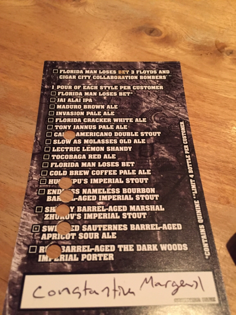Been a while. Hope everyone is doing well. Have slowed down a bit on the beer, well at least chasing the rare ones. But went to a cool even a couple weeks ago. Cigar city (Tampa) made a bet with three floyds (Chicago via Indiana) made a bet for the Stanley cup in the spring. Loser came to the others brewery and took over the taps. My Blackhawks won and two weeks ago I was lucky enough to score tickets. Cigar city did not disappoint. The ones with hole punches are ones I consumed. They also had about ~10 unique tacos that were fantastic. And finally they made a Baltic porter with quinine called "Florida man loses bet". I have not opened it yet.
