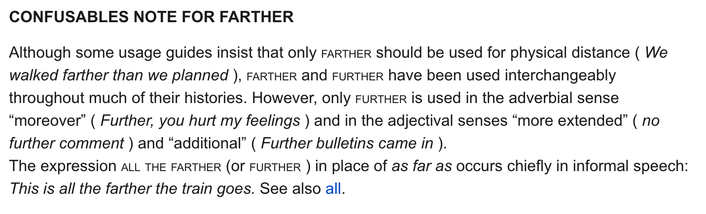 I treat dictionaries like I treat social science studies: I am highly skeptical and borderline dismissive of them, but I will cite them when they support what I understand to be common understandings. Farther has to do with literal distance, and further has to do with figurative distance, and if you use the terms differently you are contributing to confusion.