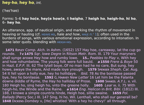 Interesting. I always (obviously incorrectly) associated it with the Seven Dwarfs’ mining song from the 1937 Disney animated movie, Snow White and the Seven Dwarfs.Once more, the OED is doing part of the hard work.