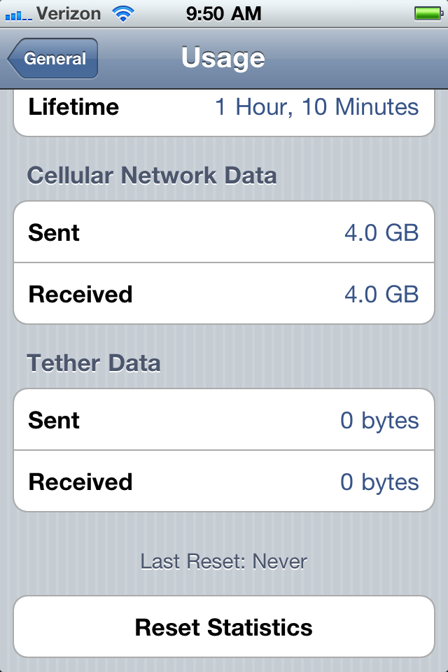 I just checked the Usage panel in the General Settings and my iPhone 4 says I've sent 4 gigs and received 4 gigs over the past week when I've never even used over 200 megs in a single month. To add to this, I have cellular data turned off for the whole phone!!! This better be a bug or there will be some damn good bitching from me.