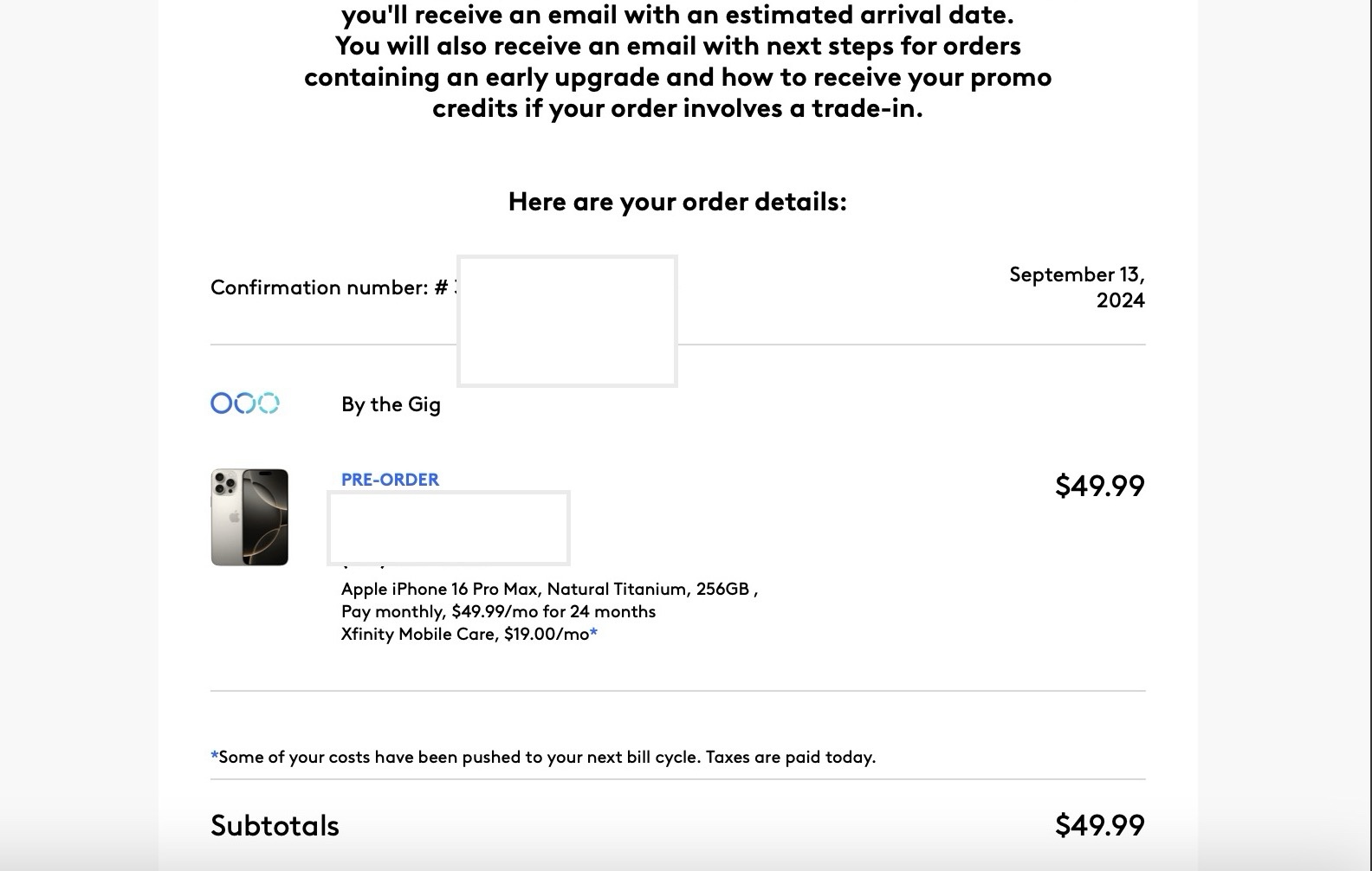 What promo did you get?I recently received a free upgrade for paying off half the iPhone 15 pro max (I received launch day last year) so I went on Xfinity website and applied the upgrade to the 16 pro max White titanium at 512Gb this morning at opening. I was constantly running out of space with the 256. I applied the upgrade online, and got confirmation it’s been placed but they needed me to verify info. I called them to speed the process up. Everything was ordered and verified in 25-30 minutes 7 o’clock CT. On track to receive 20th! Good luck guys! She told me I’d receive the phone in 1-2 business days but I think she misspoke. No way I’d get it that fast. If I do, I’ll report back. 😄