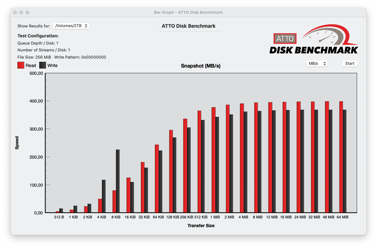 Speed is around 400mbps. Way faster than sata, but, absolutely destroyed by the Kyro M.2 evo PCIE card I've been using.
