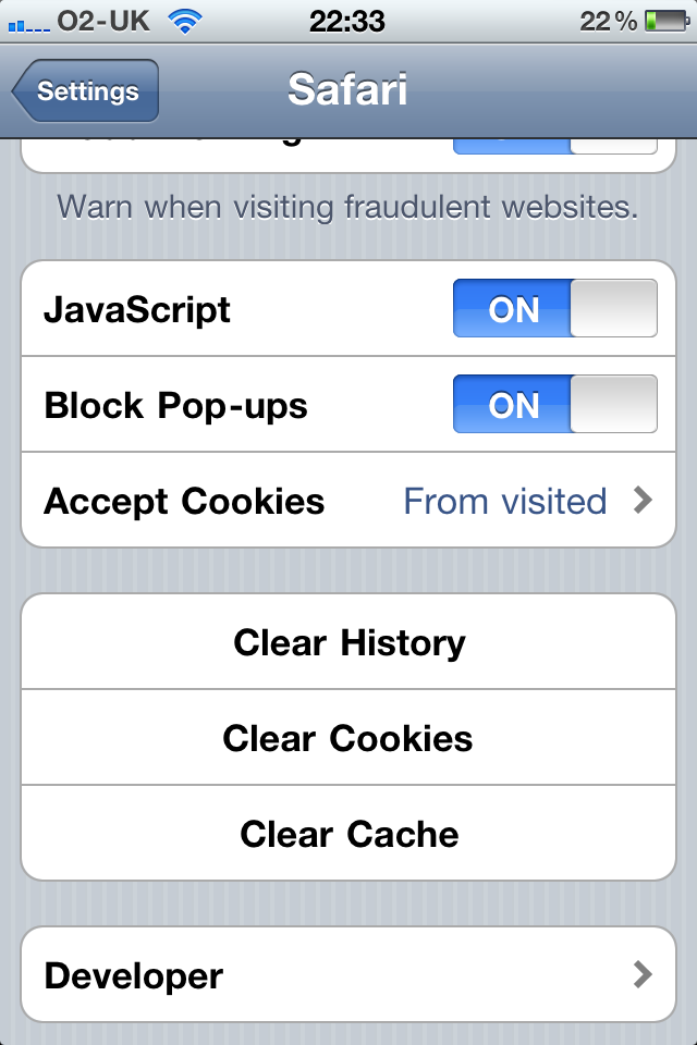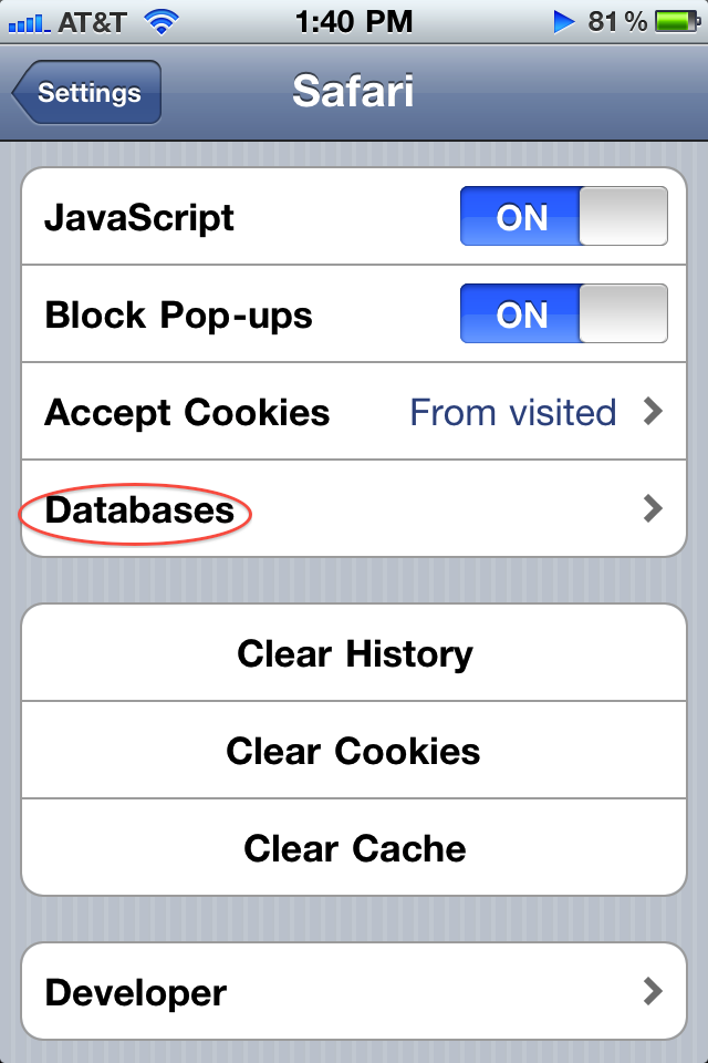EDIT: I just tried an HTML5 database example on my iPhone and it hasn't made the option appear on my iPhone 4 with 4.2.1