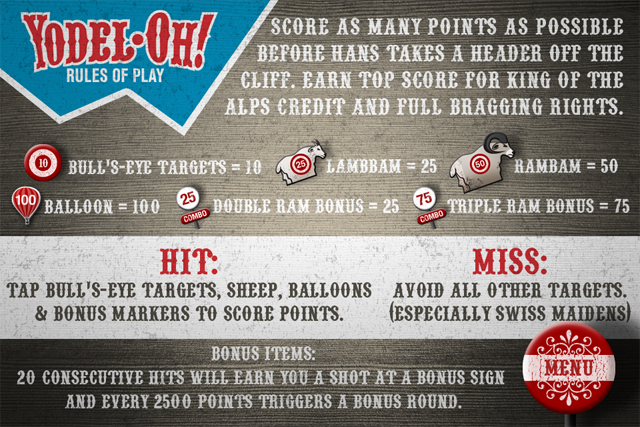 You can almost smell the schnitzel in this fast-tapping, mountain climbing adventure based on the classic tin-target carnie games. Earn points by hitting bull's eyes, bonuses and multipliers while you make your way up the hill. But remember, just because the pass is open, it doesn't mean the coast is clear. Keep a sharp look out for RamBam, LambBam and the rest of the clan and you could just be the next "King of the Alps."