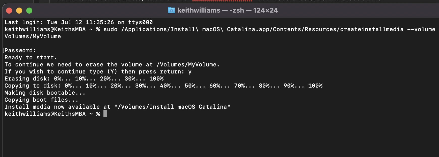 It will take a few minutes, but then the "createinstallmedia" command should work without errors.