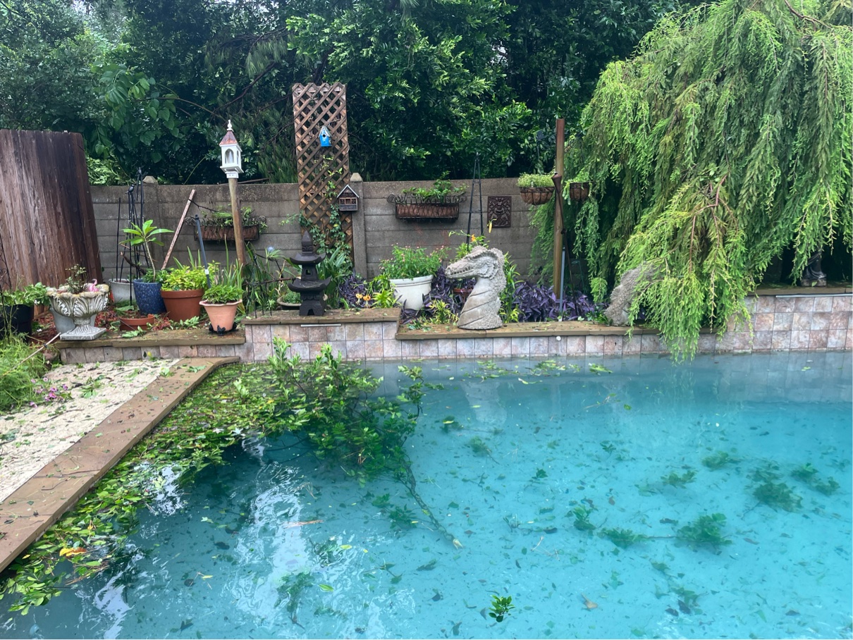 Tropical jungle cement pond. That’s not a down tree on the right but our weeping cedar.