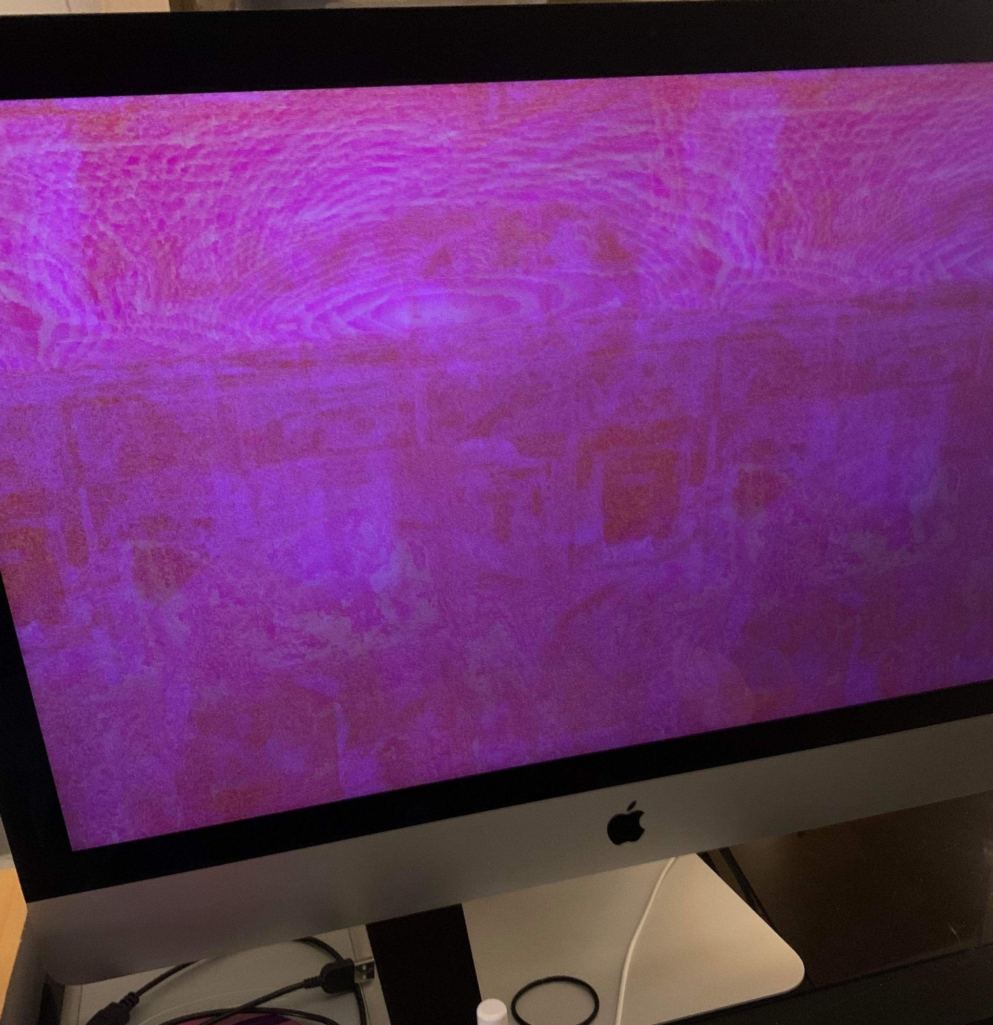 I'm cutting a 22 min show right now in Premiere. Using 4k footage (cutting with proxies but i dont checkmark the "use proxies" button in the export dialogue window). And I often run into the issue of a dialogue box popping up during export saying I've run out of application memory (see attached pic below). Theres a really short limited window, time wise, to force quit out of this applications in that pop up dialogue before the whole system locks up and freezes. Sometimes I'll queue the project in Encoder. then quit premiere and let encoder do it's thing and then it's usually not an issue. (keyword: usually). but doing the normal export out of premiere can cause this to happen a lot. I barely have any applications open. Last night, I quit out of every application. then hit export in premiere and walked away. And when the screensaver started up, around that time, that's when the computer froze (see picture of pink screen on my computer below). As I've seen it happen many times before, the computer locks up. then shuts itself down. I can't remember if it turns itself back on. But I'm really surprised this happens as often as it does because I bought this iMac in 2021. I souped it up and maxed out the ram. here are the specs: