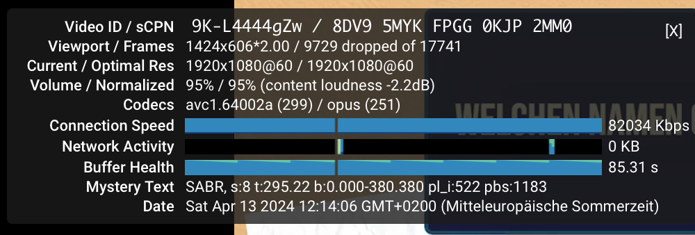 YouTube freezes and freezes and I can't do anything else. All the other browsers I've tried (Chrome, Firefox, Orion, Arc, Vivaldi) don't have the problem. I also see under "Statistics for nerds" that Safari loses a really large number of frames, which is not the case with the browsers mentioned above, at least not to the same extent.